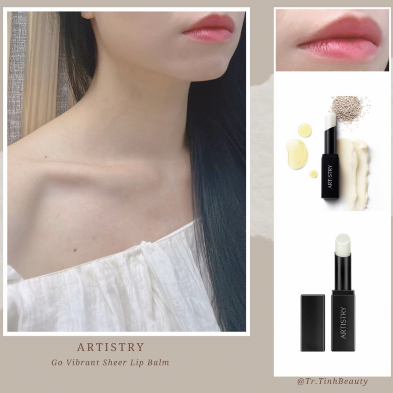 Son dưỡng Artistry Go Vibrant Sheer Lip Balm với thành phần giàu dưỡng chất tự nhiên từ Dầu hạt Chia trắng Nutrilite, Chiết xuất Nhân sâm, Bơ hạt mỡ, Nha đam, Dầu hạt hướng dương và Sáp cọ Carnauba. Son giúp dưỡng ẩm cho môi, giảm tình trạng khô và nứt môi, cho đôi môi mềm mại trông căng mọng và tươi tắn