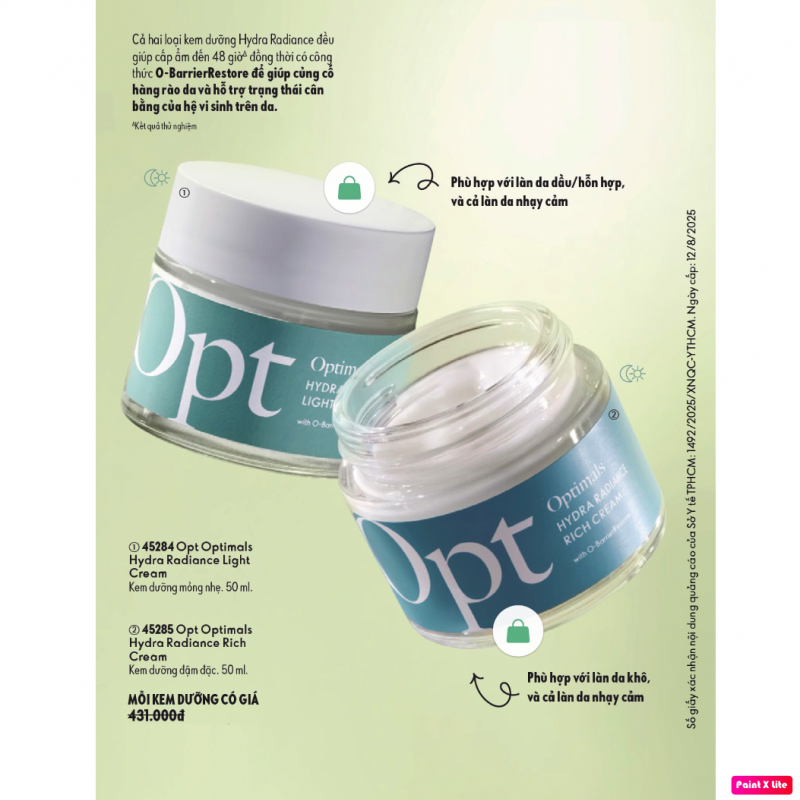 Kem dưỡng mỏng nhẹ Opt Optimals Hydra Radiance Light Cream có phức hợp O-BarrierRestore là sự kết hợp của Niacinamide và lợi khuẩn Para-probiotic, giúp củng cố hàng rào da và bổ sung độ ẩm, đồng thời hỗ trợ trạng thái cân bằng của hệ vi sinh trên da.